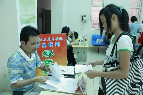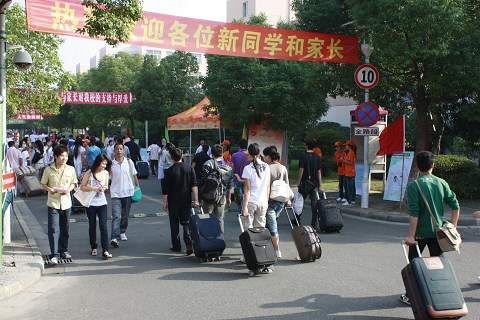 9月19日清晨7点,湖州市各汽车站和火车站的出口处就拉起了我校新生接待处的横幅,负责接待的教师和学生们学校门口翘首以待2009级新生的到来。 新生报到当天,学校安排了8辆大型客车和60多名师生在市各车站和火车站迎接新生入学。校内,学校安排了700多名青年志愿者随时为新生和新生家长提供服务,并对报到的主会场——圆顶大厅进行了合理的安排,使注册、报到、交费、咨询等提供服务的摊位位置集中、疏散便利,确保了新生快捷有序地办理入学手续。后勤公司也及时为新生安排好了住宿和生活。全校各部门、各分院都为迎接新生的到来忙碌了起来。学校还在报到现场开设了“绿色通道”,由各分院总支书记亲自负责。通过“绿色通道”,家庭经济困难学生顺利注册报到,入住寝室。在迎新现场,学校联合辖区派出所共同开展现场新生安全卫生教育,发放安全卫生知识宣传单。校摄影协会的同学在校园内设点主动引导新生和家长熟悉校园,并免费提供合影服务。在迎新客车上,学生导游利用从车站到校园的时间向新生和家长介绍学校概况和报到注册的流程安排。