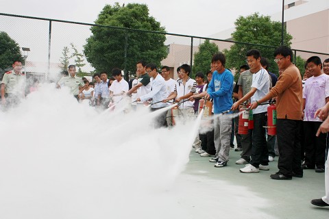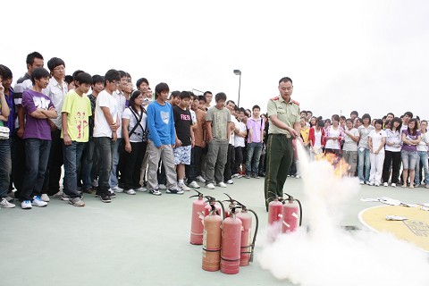 讲座后,邢红华还向同学们演示了灭火器材的使用方法,利用展板讲解有关消防安全知识。新生们亲身体验了消防灭火器的使用方法。