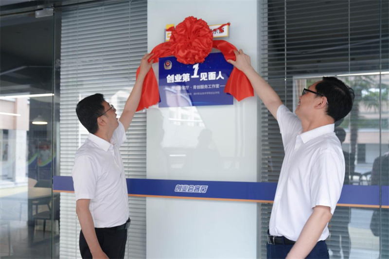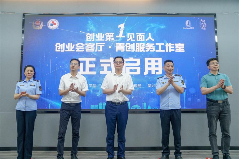 与会领导共同启用了湖州职业技术学院“创业会客厅·青创服务工作室”,实地考察了学校创业园,并为服务工作室揭牌。(文/刘野 摄/校融媒体中心)