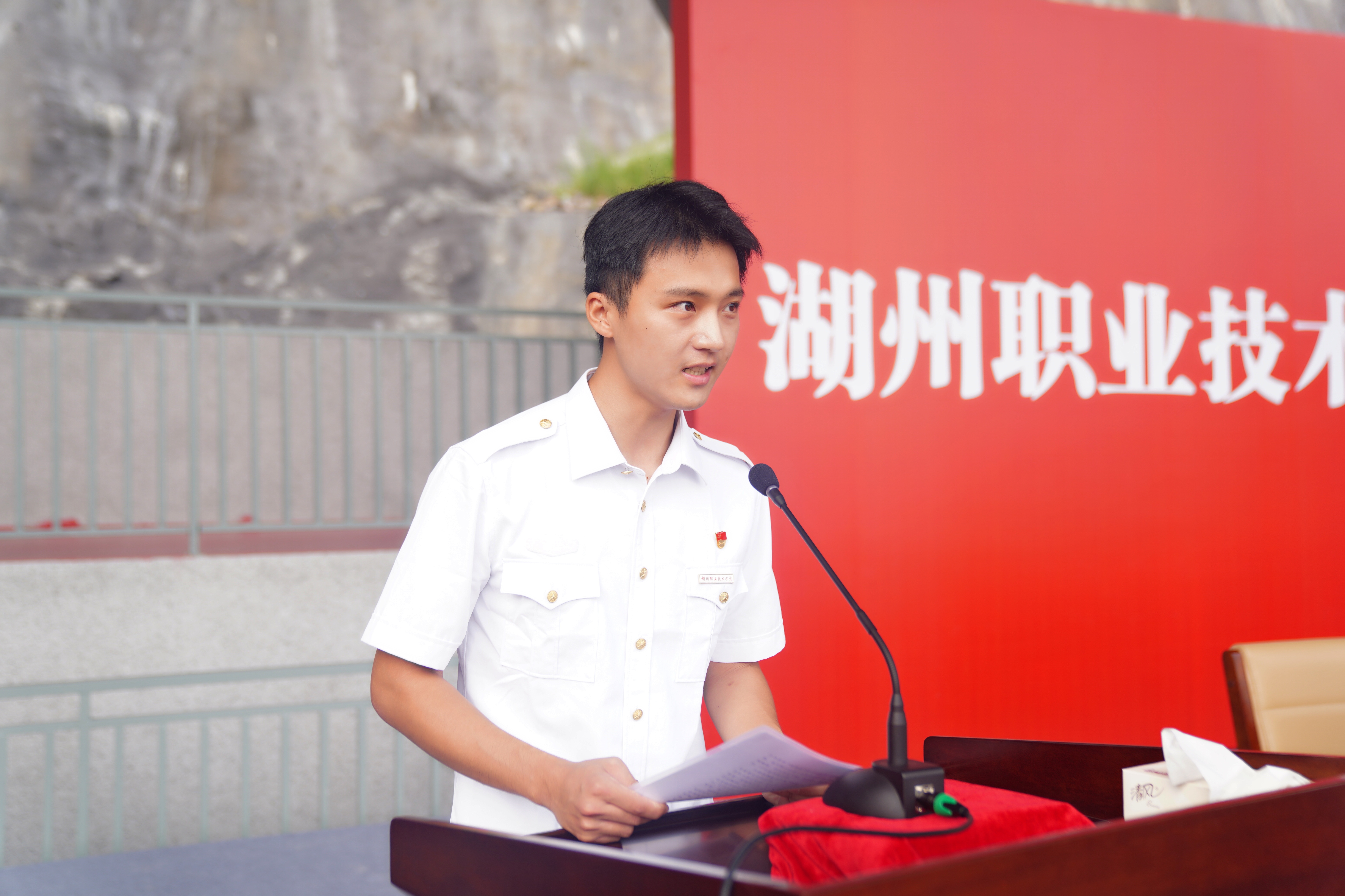 出席典礼的主席台领导为新生代表佩戴“湖州职业技术学院”校徽,这一刻他们正式成为湖职人,秉承“崇德尚能”校训,找准人生前行的航道与坐标,书写属于自己的辉煌篇章。