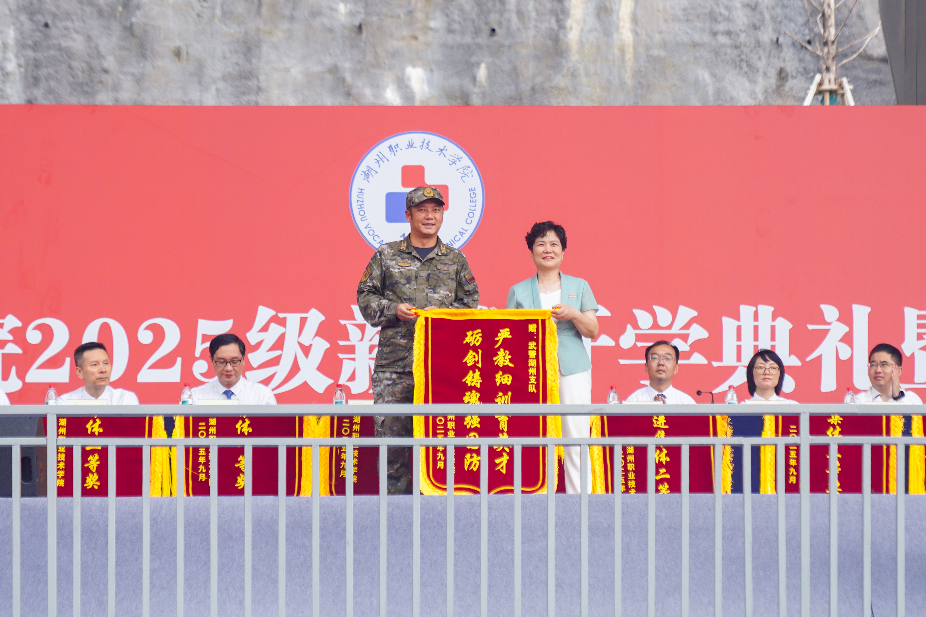 秋风为序启征程,奋楫前行谱新章。9月30日,湖州职业技术学院2025级新生开学典礼暨军训总结大会隆重举行。全体新生齐聚西塞山下、相约镜湖之畔,带着对未来的美好憧憬,在湖州职院扬帆起航,开启新的旅程。校党委书记金淦英、校长肖先波等校党政班子成员,承训部队领导,校警驿站警官,学生工作部、教务处负责人,全日制二级学院党总支书记,副书记,承训部队官兵,教师代表、校友代表、全体新生及班主任、辅导员、老生代表、获奖学生代表等参加典礼。党委委员、副校长何彦虎主持典礼仪式。